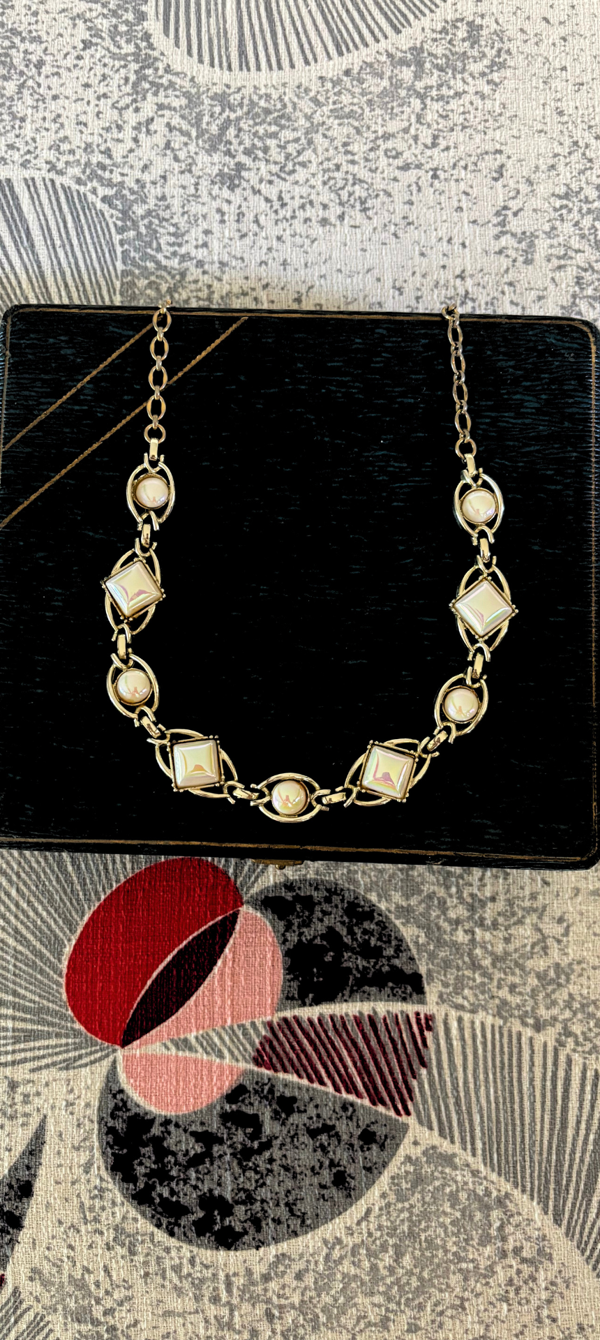 It started at a folding table in Florida, when Aunt Nan told me I could pick a piece from her display of vintage jewelry. I was eight. I chose the pearlescent lucite necklace you see above, with matching clip-ons — and I’ve been chasing that spark ever since.